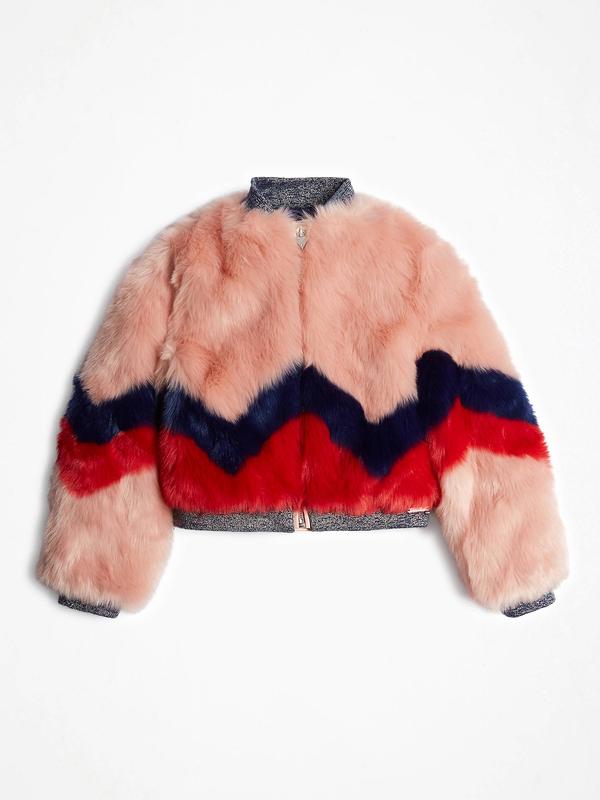 Шубка зі шучного хутра бренду Guess. Логотип спереду. Резинові вставки на рукавах та знизу. Склад: 100% поліестер. Розміри: 7 – 16 (18) років