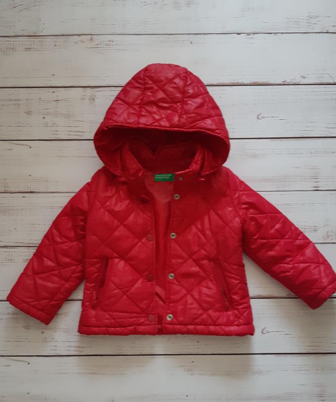 Куртка на кнопках в ідеальному стані, колір трохи спотворений на фото, не такий прям червоний. Довжина без капюшона (відстібається) 35, рукав-32, пог 32. Можна з 1-1,5 року.