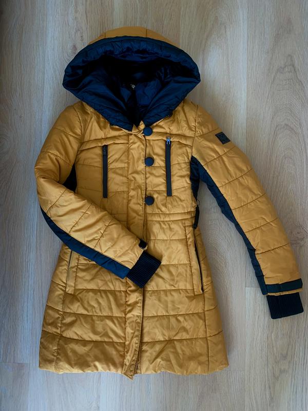 Зимове пальто дитяче гірчичного кольору з капюшоном Є затяжки на талії Виробник Туреччина Дуже тепла Розмір 36 Є дефект: трохи подерта тканину із зворотного боку кнопок Довжина куртки 82 см Довжина рукава 62 см