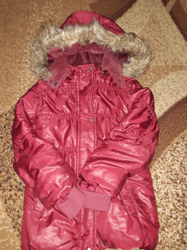 зимова курточка, яскрава, тепла, горло закриває повністю, капюшон знімається, внизу резиночка щоб не піддувало, на рукавчиках манжети, з дефектів ззаду є невеликі зачіпки в шкарпетці взагалі не помітно, довжина 52, пог 32