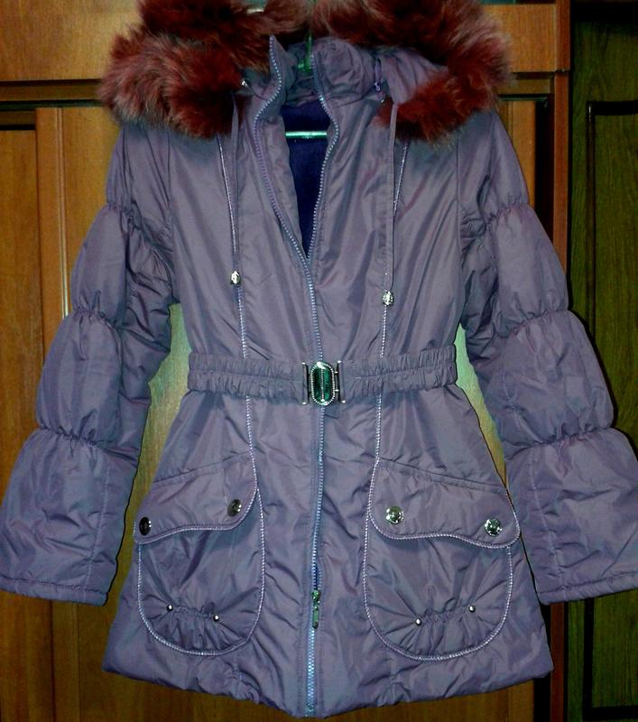 Тепла куртка з капюшоном для дівчинки Для дуже холодної осені, але не для мінусових температур. Клопіт з блискавкою - то застібається, то розходитися. Довжина виробу по спині 70 см Довжина грудей від пахв (напів обхват) 43 см Довжина по лінії талії (напів обхват) 42 см Довжина рукава 56. Плече 11 см Дві глибоких бічних кишені на залізних кнопках. Капюшон на блискавці, з штучним хутром. Пояс із зручною металевою застібкою.