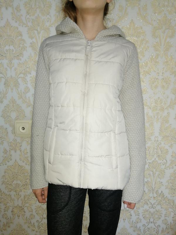 Кофта в'язана 100% акрил. Перед - плащівка з утеплювачем. На теплу весну або осінь. Красива велика в'язка, густа, м'яка. Купила в Антошке. Дуже хорошої якості. Дві кишені, капюшон. Ідеальний стан, без дефектів. Прямий фасон. Заміри: Довжина - 55 см рукав - 59 см Плечі ширина - 42 см Обхват грудей -80 см Низ обхват - 84 см