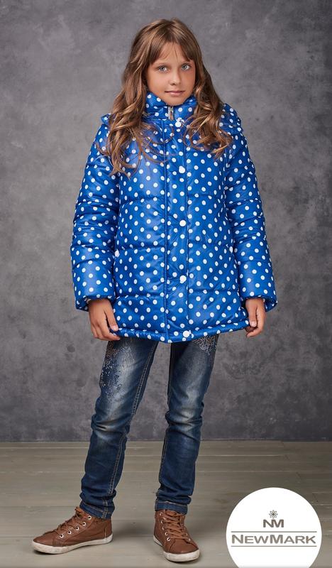 Дуже тепла курточка для дівчинки, стан нової, колір синій електрик в білий горох. Состав: ткань верха - полиэстер 100%, ткань подкладки нейлон, утеплитель - синтепон силиконизированный Плотность утеплителя: 250 г/кв.м. ― морозная зима (обеспечивает ощущение комфорта и при 0 °С, и при -20°С.)