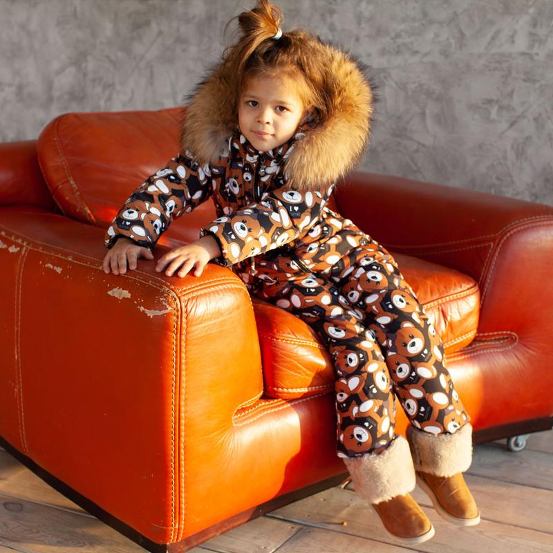 Зимовий комбінезон для дітей з принтом "Ведмедики" і опушкою з натурального хутра подчернет індивідуальність дитини. Практичний і зручний фасон, якісні матеріали захистять дітей від примх погоди під час активних прогулянок.