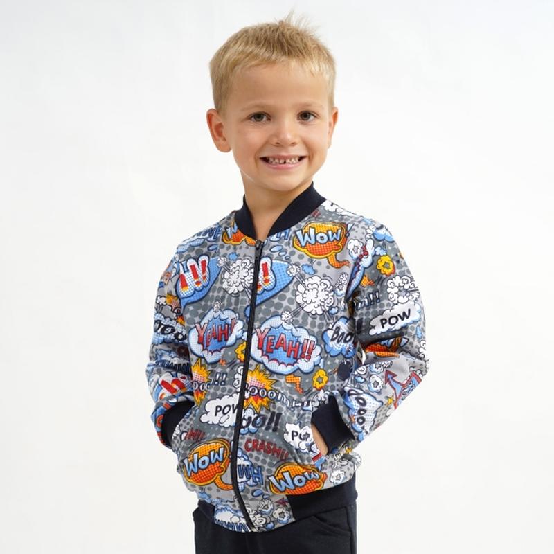 Сверхмодный бомбер для мальчика. Эта легкая куртка с резинками на окончаниях рукавов и на поясе стала неотъемлемой частью гардероба деток. Стильная куртка застегивается на молнию, хорошо держит тепло и защищает от ветра. Ткань - двухнитка, немного тянется, но не теряет форму. Цена зависит от размера. Замеры: Рост 92см(2 года):Длина-37см,Ширина по груди-31см,Рукав-31см; Рост 98см (3 года):Длина-38см,Ширина по груди-31см,Рукав-32см; Рост 104см(4 года):Длина-39см,Ширина по груди-31см,Рукав-33см; Рост 110см(5 лет):Длина-41см,Ширина по груди-33см,Рукав-35см; Рост 116см (6 лет):Длина-42см,Ширина по груди-33см,Рукав-37см.