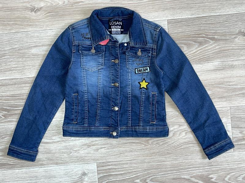 Джинсовая курточка с нашивками. Состояние новой без дефектов 10 лет Длина 44. ПОГ 38. Рукав 50