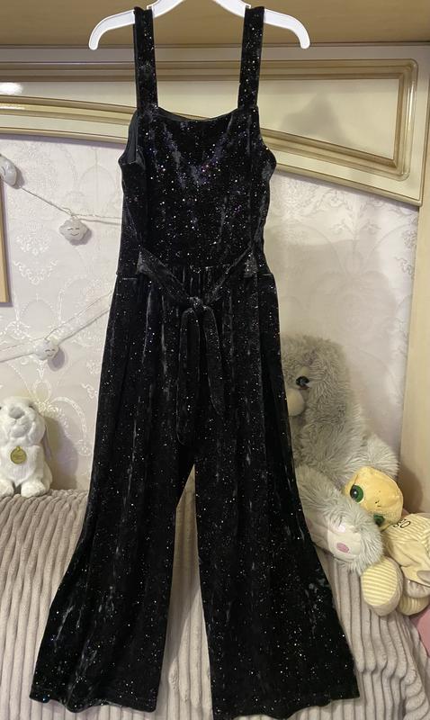 Мʼякий, блискучий, зручний. Стан нового. Якість супер. На бретелях є ґудзик для регулювання довжини (два варіанти). Можна носити у вигляді вкорочених штанів, можна як повноцінну довжину. Заміри : Довжина від бретелей 90 см. Довжина з бретелями 100 см. Крок 42 см. Довжина штанів від талії 65 см.