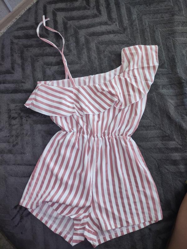 комбінезон на одне плече, на іншому зв'язується, вироблено в Україні, довжина від плеча 62 см, пояс на резинці 23, тканина не тягнеться.