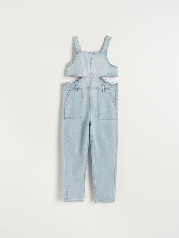 Широкі плечові ремені, декоративні вирізи, дві кишені спереду довгі штанини, регулятор зросту на ременях, 3 ступені. склад головної тканини: 100% бавовна