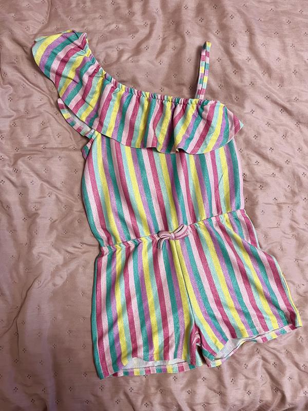 Новий блискучий ромпер розмір 128-134 не одягався жодного разу, не встигли поносити, дуже гарний. Заміри: Поважна довжина від плеча 62-63 Ширина пояса 30,5 Ширина під мишками 34