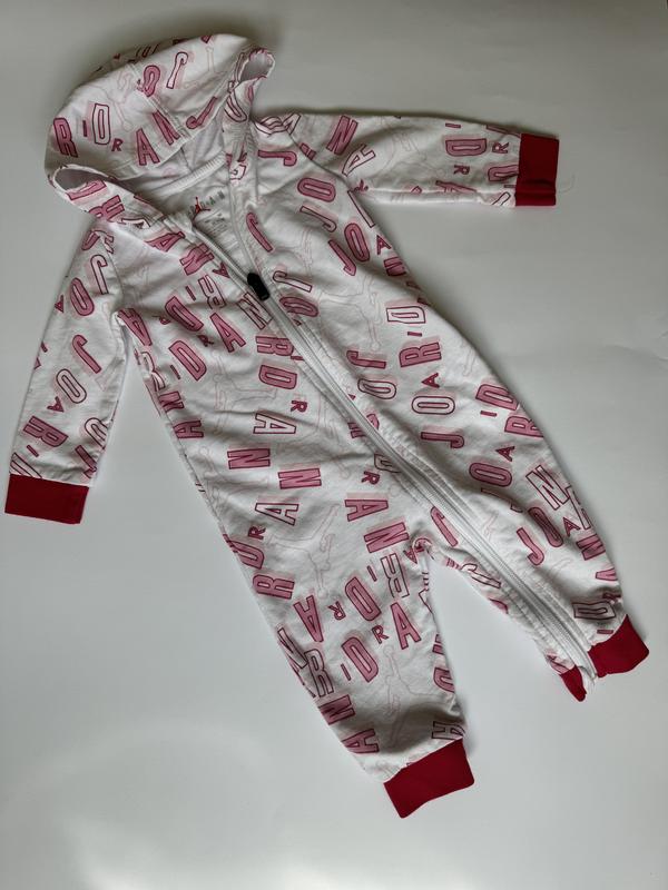 Стильний комбінезончик Jordan для малюка — білий із фірмовим рожевим принтом. Розмір: 6–9 міс (орієнтовно до 74 см) Матеріал: 100% бавовна — дуже м’який і дихаючий, приємний до тіла Має зручну застібку на блискавку, манжети на рукавах і ніжках — комфортно одягати й зручно носити. Стан ідеальний — без плям, пошкоджень