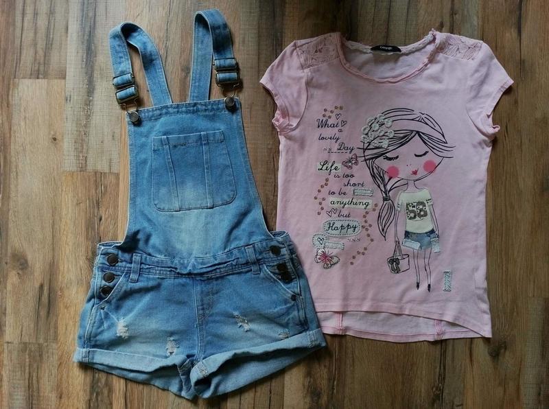 комплект на 8-9 років футболка ( довжина по спинці 49см, довжина переду 45см, ширина 33см) комбез ( довжина без лямок 43см, довжина шортів 21см можна почати підворот і буде 22см, в поясі 33см)
