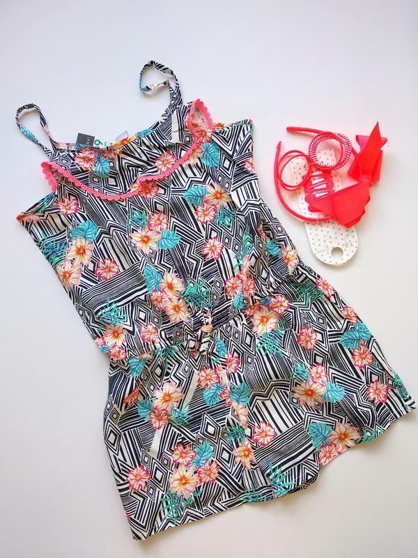 Размер 146 см (10-11 лет). Ромпер для девочки торговой марки Primark (Испания). Ромпер на тонких бретелях в цветочный принт с воланом впереди. Свободный крой, пояс на резинке, тонкая прохладная ткань (вискоза) - отличный вариант для жаркого лета. общая длина/длина до талии 64 см/ 40 см ширина по груди 38 см ширина по резинке 31 см высота посадки (от резинки) 23,5 см ширина по бедрам (прибл.) 42-43 см Состав: 100% viscose Без торга. 100% оплата на карту Приватбанка или наложенный платеж Новой почтой по предоплате. Доставка Новая почта, Justin, Укрпочта. Есть самовывоз в г. Харьков