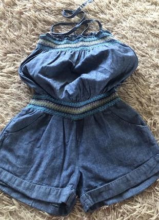 Легкий джинсовий комбінезон із шортиками з кишенями. На зав'язку на шийку. На поясі резинка. Дуже стильно виглядає. На вік 7/8 років. Стан ідеальний