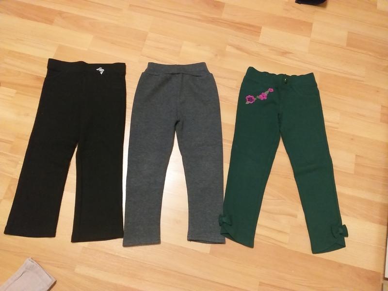 Штани на дівчинку на вік 3/4роки в хорошому стані без дефектів. 1. Чорні брючки 104 ріст Довжина 55 Ширина 24 Крок 38 2. Сірі лосіни теплі з бантиками на 104 ріст Довжина 56 Ширина 20 Крок 37 3. Зелені штанці на 104 ріст Довжина 55 Ширина 24 Крок 41