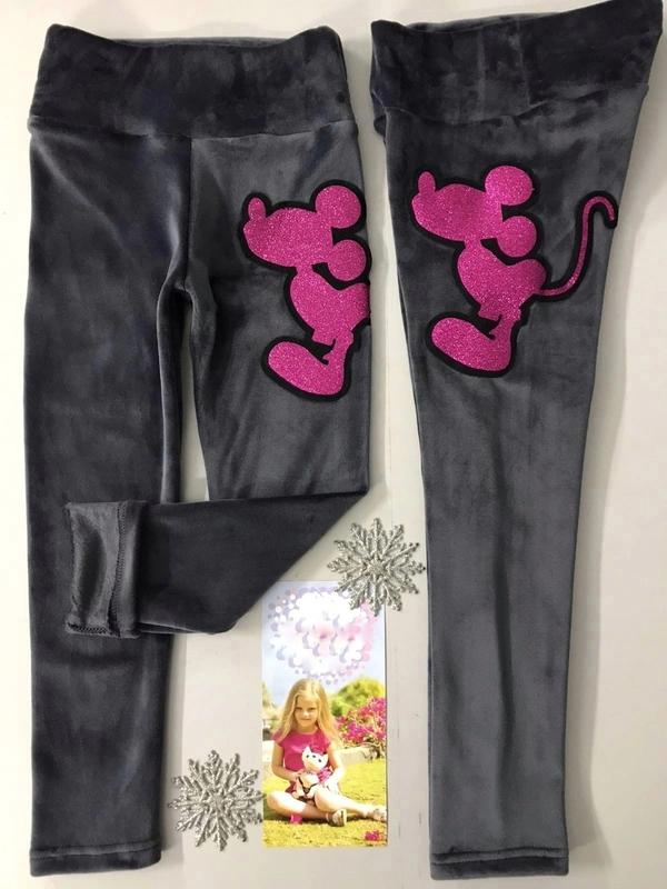 Лосинки з велюру на хутрі з аплієкацією ціна 290 грн Виміри: довжина\крок\пояс 98-56\38\22 104-61\42\23 Наявність: 98 98 104 104