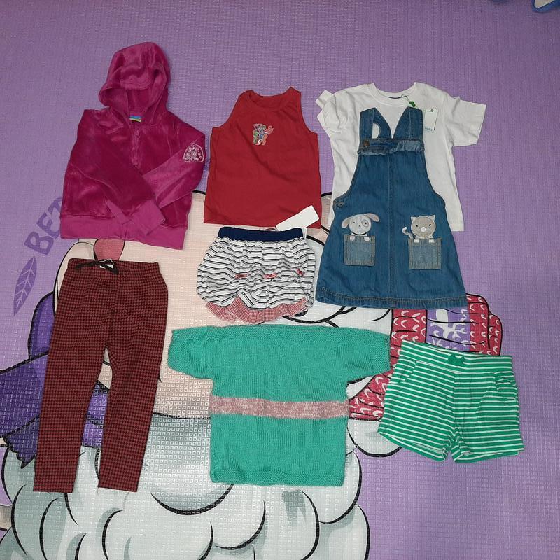 Зріст написано 98 см. В сеті рожевий велюровый бомбер, червона майка Pjmask, спідничка з етикеткою, біла футболка з етикеткою-дуже приємна бавовна органік ( потребує прання, бо біле завжди швидко запилюється) , джинсовый сарафан, нові шорты в зелену смужку, нові легінси zara, нова вязаная футболка