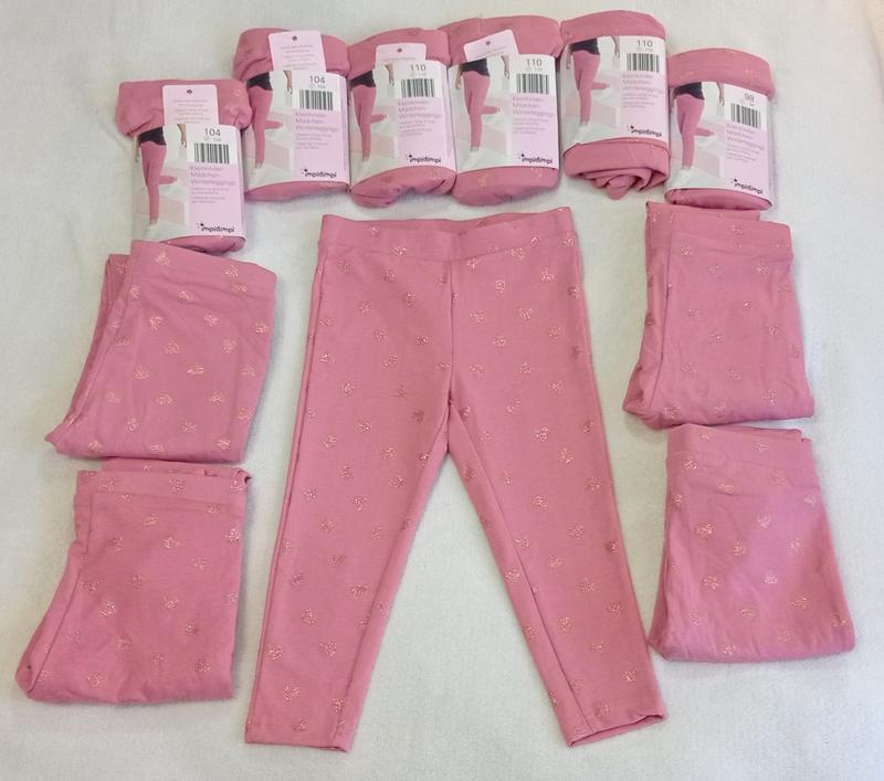 Утеплені лосини від німецького бренду Impidimbi. Декоровані сердечками, які не осипаються. М'яка та приємна до тіла тканина. Гарно тягнеться. Не кошлатиться при носінні. Склад: 95% котон 5 %еластан Розміри: 110 (4шт) Заміри Розмір 110 Довжина 58 Крок 40 Посадка 18 Резинка 24 ПО Бедра 27 ПО