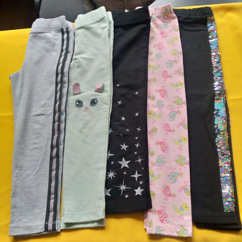 Лосины деми на 3-4-5 лет. Все по 55 грн. Фото 2: длина с резинкой 61 см, серые, с полоской сбоку. По наборке на рост 110 см. Фото 3: длина с резинкой 60 см, салатовые, с ушками. По наборке на рост 110 см. Фото 4: длина с резинкой 58 см, черные, с серебряными звездочками. По наборке на рост 110 см. Фото 5: длина с резинкой 63 см, розовые, с птичками. По наборке на рост 120 см. Фото 6: длина с резинкой 62 см, черные, с пайетками, Waikiki. По наборке на рост 110-116 см. Все лосины в хорошем состоянии (для садика).