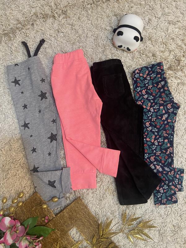 Штани на дівчинку на 2-3 роки. Тоненькі літні в зірочку, рожеві плотненькі двонітка петля, вельветові чорні та х/б лосіни. Заміри на фото. Стан відмінний.