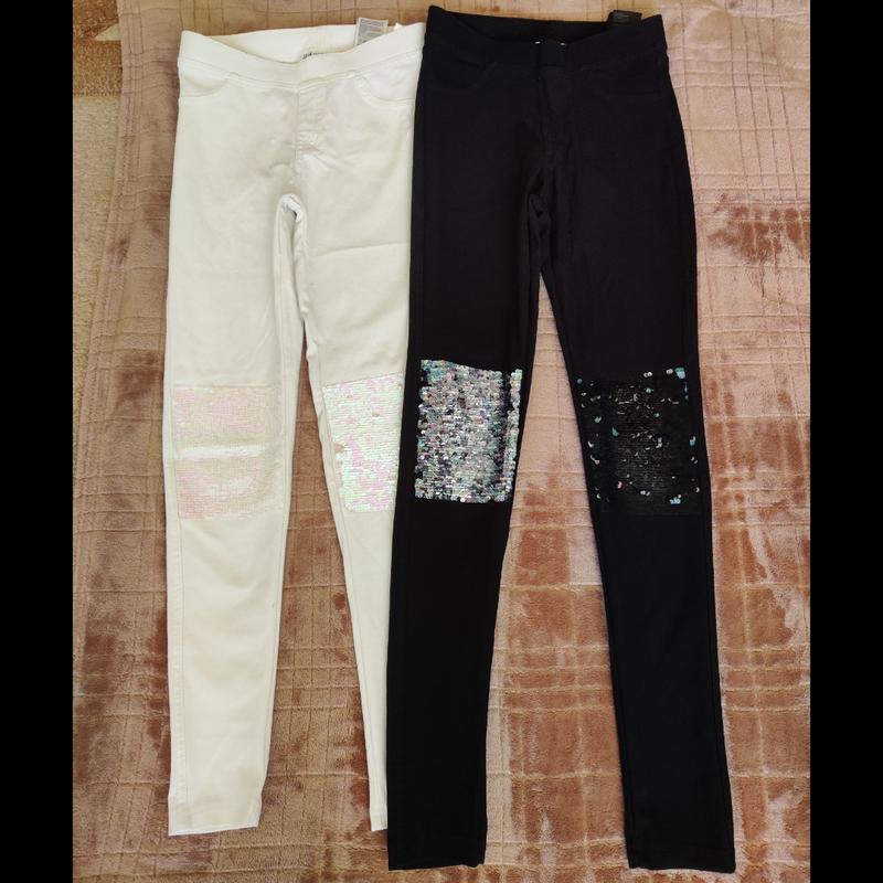 стильні, гарно тягнуться, двосторонні паєтки. чорні довжина 90, вн шов 67, талія 31тягнеться до 38, бедра 37-45. білі укорочені довжина 86, вн шов 65. талія 31-37. бедра 37-45. чорні стан ідеальний ( 250 грн) білі дуже хороший( 200)