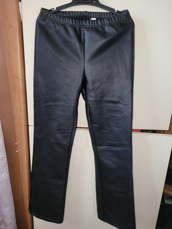 Из кожзаменителя, утепленные брюки-лосины. Длина -75 см. Немного расширенные к низу.