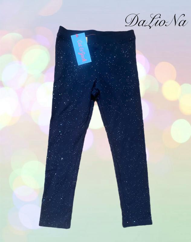 Лосини (без утеплення), зображені на фото, є дитячими, чорного кольору з блискітками, що імітують зоряне небо. Вони мають еластичний пояс та бирку від бренду "Cat & Jack". Тканина: бавовна. Вік: 4 роки. Заміри: - довжина пояса: 22,5 см., тягнеться до: 28 см.; - довжина від пояса: 58 см.