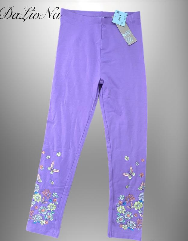 ❤️❤️РОЗПРОДАЖ❤️❤️ Це дитячі легінси бузкового кольору. Розмір: 7. Вони прикрашені яскравим квітковим візерунком та метеликами в нижній частині обох штанин. Тканина: бавовна. Заміри: - довжина пояса: 25 см., тягнеться до: 30 см.; - довжина лосин від поясу: 73 см.