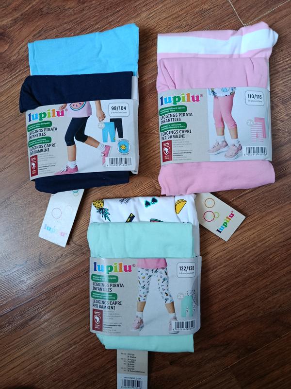 Склад 95%% бавовна якість на висоті в наявності розміри 98/104,110/116 ціна комплекта 270 грн/2 шт 122/128 295грн/ набір Укорочені лосини (капрі) для дівчинки від німецького дитячого бренду Lupilu®. Зручні та практичні, еластичні та не сковують рухів, з широкою м'якою гумкою на поясі. Виготовлені із приємного до тіла трикотажу. Тканина не втрачає яскравість фарб та форму, має відмінну зносостійкість та тривалий період експлуатації.