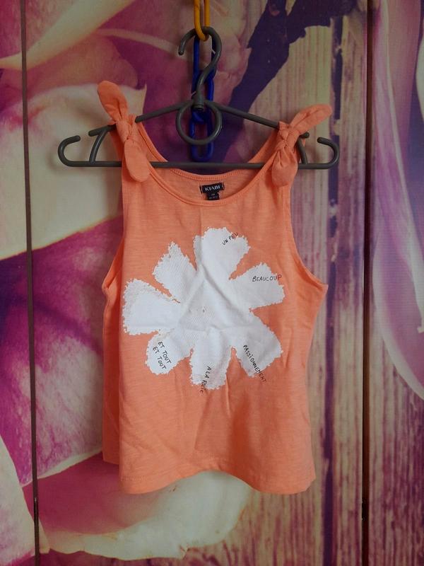 Дуже гарна, легенька майка-топ на дівчінку. р.6А (114-119 см): ширина - 32 см, довжина - 39 см Склад: 100% бавовна