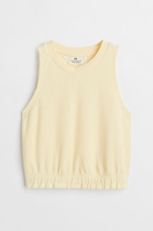 80% бавовна, 20% поліестер Укорочений топ-жилет з м'якої махри з ребристою обробкою по горловині та закритою гумкою по нижньому краю. Напівобхват грудей 42см, довжина виробу 45см.