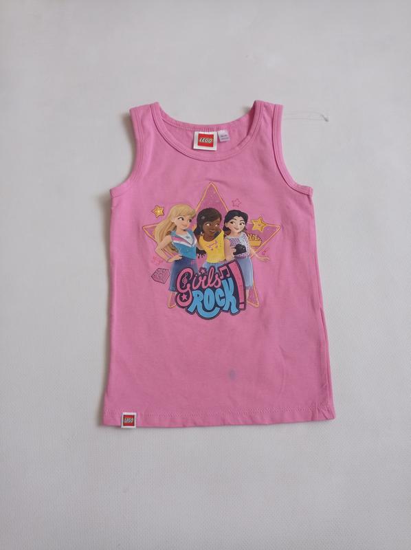 Майка для девочки с рисунком LEGO Friends. Яркая и качественная. Есть нюанс. Попачкана спереди внизу. Отстирать не пыталась. Видно на фото, учтено в цене. Замеры: плечи 20 см под мышками 25 см длина 40 см Состав 95% хлопок, 5% эластан