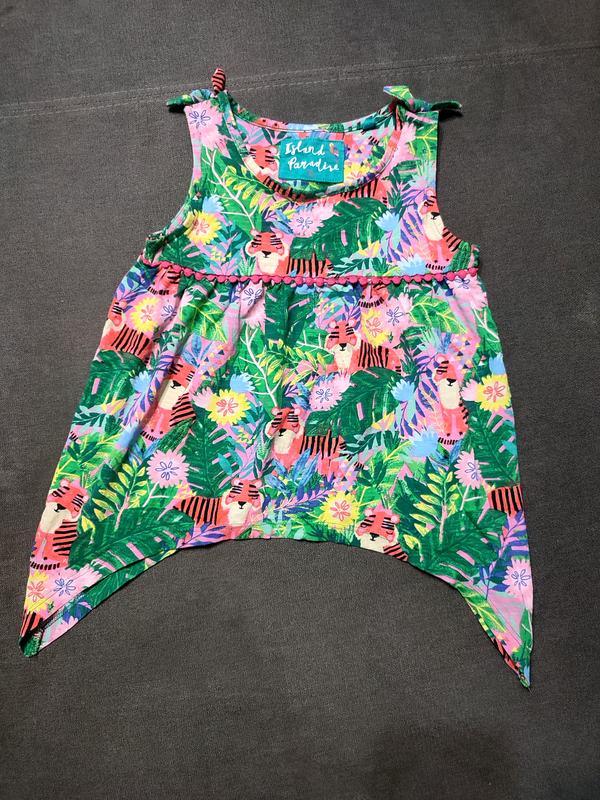 3-4 года 98-104 см., согласно бирки. 100% хлопок-те, что надо для летних прогулок. Замеры: длина с "хвостиками" 50 см., длина "без хвостиков" 39 см.,ширина по плечам 22 см., ширина под подмышками 29 см., ширина по подолу 43 см.