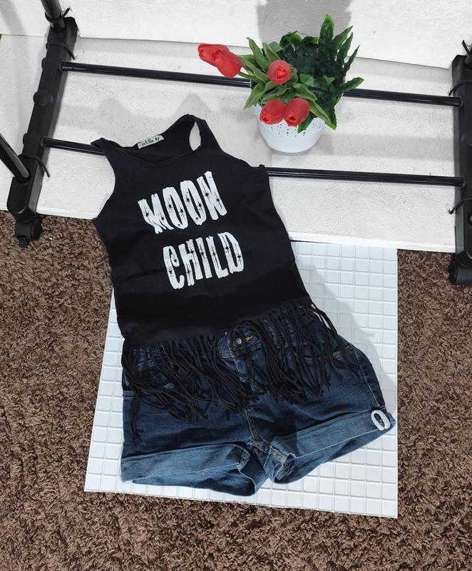 Майка дитяча чорного кольору з бахромою понизу. Особливості виробу додають неороблені краї горловини та пройми рукавів. Тканина трохи тягнеться ( 100% органічна бавовна). Ширина 33 Довжина збоку від пройми30, з бахромою 44 Довжина по спинці 43, з бахромою 58 Заміри також є на фото. Запрошую переглянути інші мої оголошення. Щодня новинки. Дякую за підписку. Обираючи декілька речей, відправляємо однією посилкою.