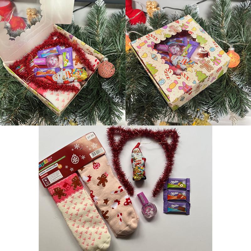☃️ ПОДАРУНКОВИЙ БОКС ☃️ 🎁теплі шкарпетки з новорічним принтом розмір на вибір 23-26 або 27-30 🎁Kinder дід мороз 🎁 міні шоколадки Milka 3шт 🎁обруч святковий з вушками 🎁дитячий лак для нігтів MARTINELIA