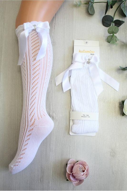 Гольфи білі ажурні з бантом (на банті стрази) Гольфи однотонні. Декор - ажурний геометричний візерунок та бант із атласної стрічки (в тон основної тканини). Вік 11-12 років (2 шт) Розмір: 32-34 Країна виробництва: Туреччина Ціна 110 грн за 1 пару