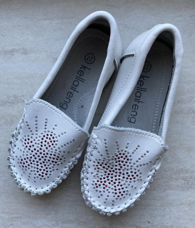 Полностью кожаные мокасины (внешний, внутри, стелька). Мʼякі, зручні, легкі. Стан идеален, одевали 2 раза в помещении (на подошве только видно это, все остальное – словно новые). Примечание: пятночка на стельке (см.фото) это от производителя (как будто следует от клея). Есть фирменная коробочка. Размер 27