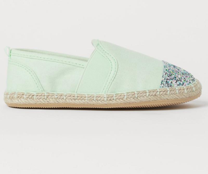 Мокасини з бавовняного полотна з еластичними вставками з обох боків. Спереду декоровані глітером, петля ззаду, плетена мішковина навколо підошви. Підкладка та устілка з бавовняного полотна. Ребриста підошва.
