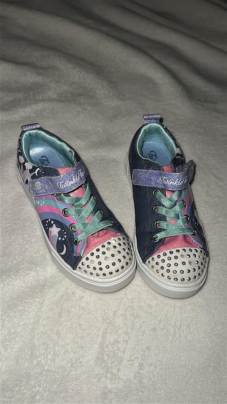Мокасини для дівчинки у джинсовому кольорі з рожевою вставкою та стразами,на блакитній шнурівці та липучці .На носку не вистачає де кілька стразів .