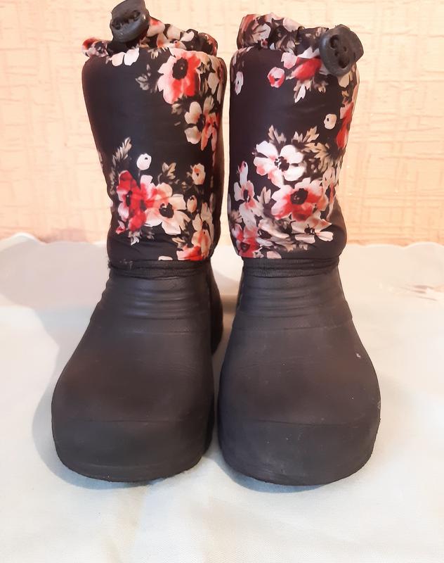 Чоботи комбіновані, снизу гума по щіколотку, далі не промокаема тканина Втутрі утеплені штучний хутром. Чоботи на 28 розмір висота 19 см піл обхват халяви 10 см