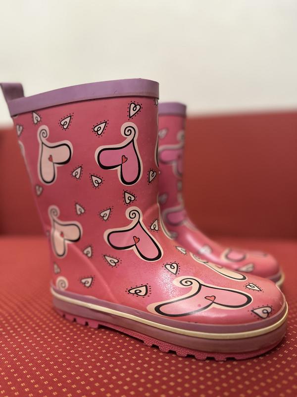 🔹 Яскраві рожеві гумові чобітки з веселим принтом у вигляді сердечок. 🔹 Підійдуть для осінньої або весняної погоди, не бояться калюж і бруду. 🔹 Внутрішня частина гладка, легко миється. 🔹 Підошва рельєфна, майже не стерта, має добрий зчіп. 🔹 Є невеликі потертості на носках, місцями заломи гуми та потертість верхніх фіолетових країв — все видно на фото. 📏 Заміри: • Довжина устілки: ~17.5–18 см • Загальна висота чобота: ~19 см • Ширина підошви спереду: ~7 см