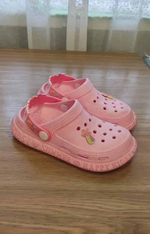 дитячі рожеві сабо з принтом веселки та написом "Happy Kids Summer". 30 розмір- 18.5 см