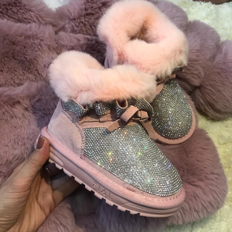 Детские угги для девочки, декорирование стразами, на застежке молния. Верх замш. Середина штучне хутро! верх декор натуральне хутро Подошва нескользкая и прошитая Присутствуют в 26 размере, указанном фабрично Стелька, к сожалению, не вынимается. Дополнительные замеры делаем по запросу!
