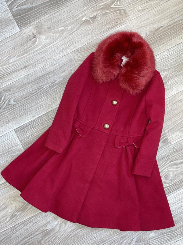 Детское красное пальто По бокам 2 кармана Застёгивается на пуговки Мех на вороте съёмный, искусственный Подкладочная ткань полиестер Состояние идеальное 🏷Monsoon 5-6 лет Длина 65. ПОГ 36. Рукав 40. Плечи 27