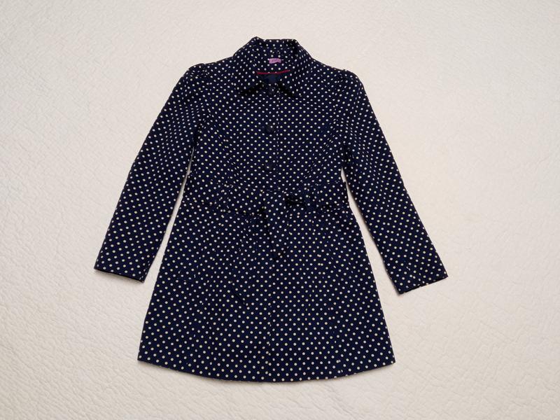 Пальто демисезонное. На теплую -осень. Очень красиво смотрится на ребенке. Застежка на пуговицы в верхней части и кнопки в нижней. Есть карманы. Пояс при необходимости снимается. Цвет синий с молочными горохами. Стан - идеальный. Нюансов нет.
