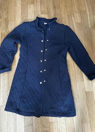 Стильное, коттоновое пальто на золотых кнопках известного французского бренда. Классическое, элегантное, приталенное, с кармашками. Идеальный вариант для школы. Цвет темно-синий, не яркий, как на последних фото. Без особых следов носки.