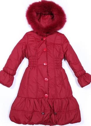 Пальто для девочки Kiko. Опушка - натуральный мех, снимается. Капюшон глубокий, не снимается; с внутренней стороны капюшона затяжка. Рукава с отворотом для регулировки длины и стрикотажными манжетами изнутри для сохранения тепла. Снизу пальто также подтягивается кулиской. Состав: Верх - полиэстер Подкладка - полиамид Наполнитель - полиэстер Размеры в наличии: 140, 152, 158, 170 Цвет бордо. Верхня тканина матова Замеры: 146 размер Рукав от плеча 50 см Длина по спине 85 см 152 размер Рукав от плеча 55 см Длина по спине 88 см 158 размер Рукав от плеча 58 см Длина по спине 93 см 164 размер Рукав от плеча 60 см Длина по спине 95 см 170 размер Рукав от плеча 62 см Длина по спине 98 см