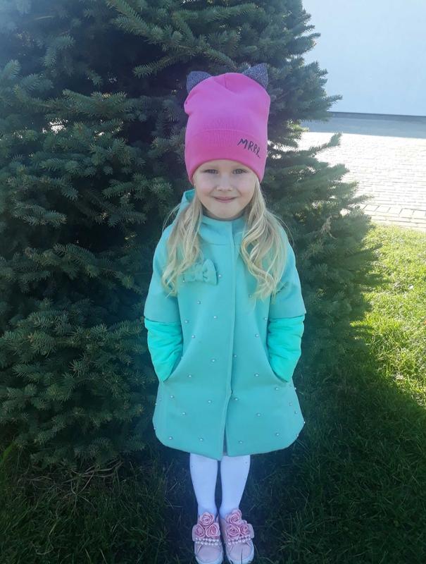 Ошатне та стильне демісезонне пальто з перлинами, розмір вказаний на зріст 104 см. Колір м'ятний. Довжина по спинці 50 см рукав від горловини 38 см.