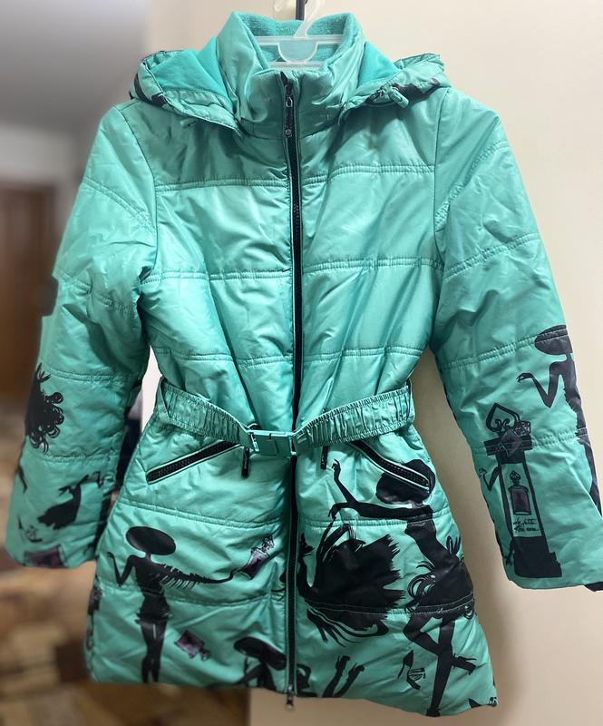 Пальто демисезонне р.128 під поясочок (знімається). Довжина - 68см, довжина рукава - 51см, ширина по плечах - 36см. Капюшон на кнопках, знімається.