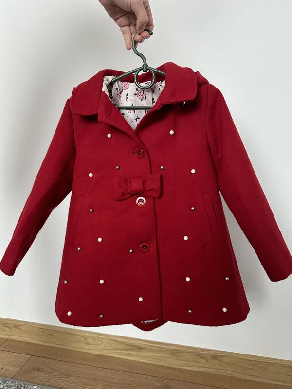 Пальто червоне кашемірове з капюшоном розмір 104,довжина пальта 50см,довжина рукава 39 см,ширина спини 27 см